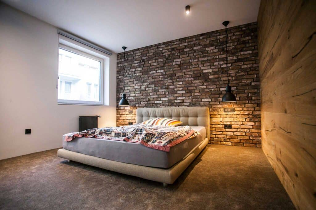 Moderná spálňa s autentickou tehlovou stenou